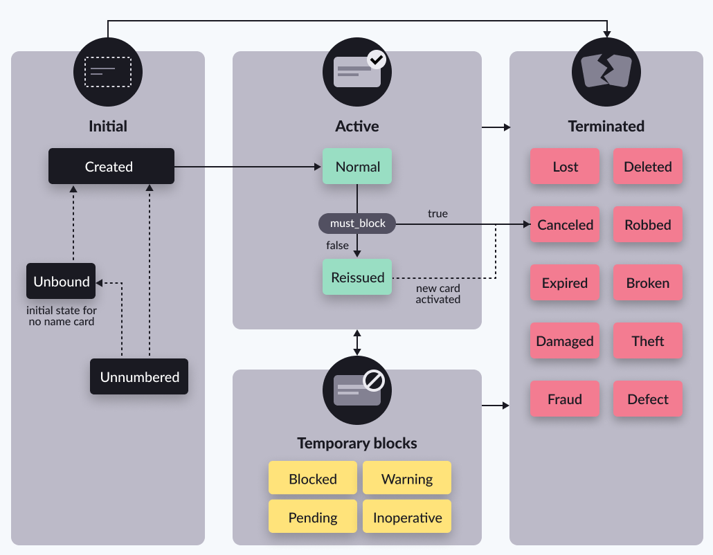 | UNNUMBERED | Initial | Card created without a PAN or a PIN that the issuer needs to define. Once the PAN is defined for a nominal card, the card's status becomes CREATED, for a noname card, its status becomes UNBOUND |