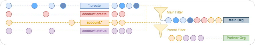 The following figure shows the flow of filtering and sending different events (represented by color) from one Org (the parent Org) to a partner Org.