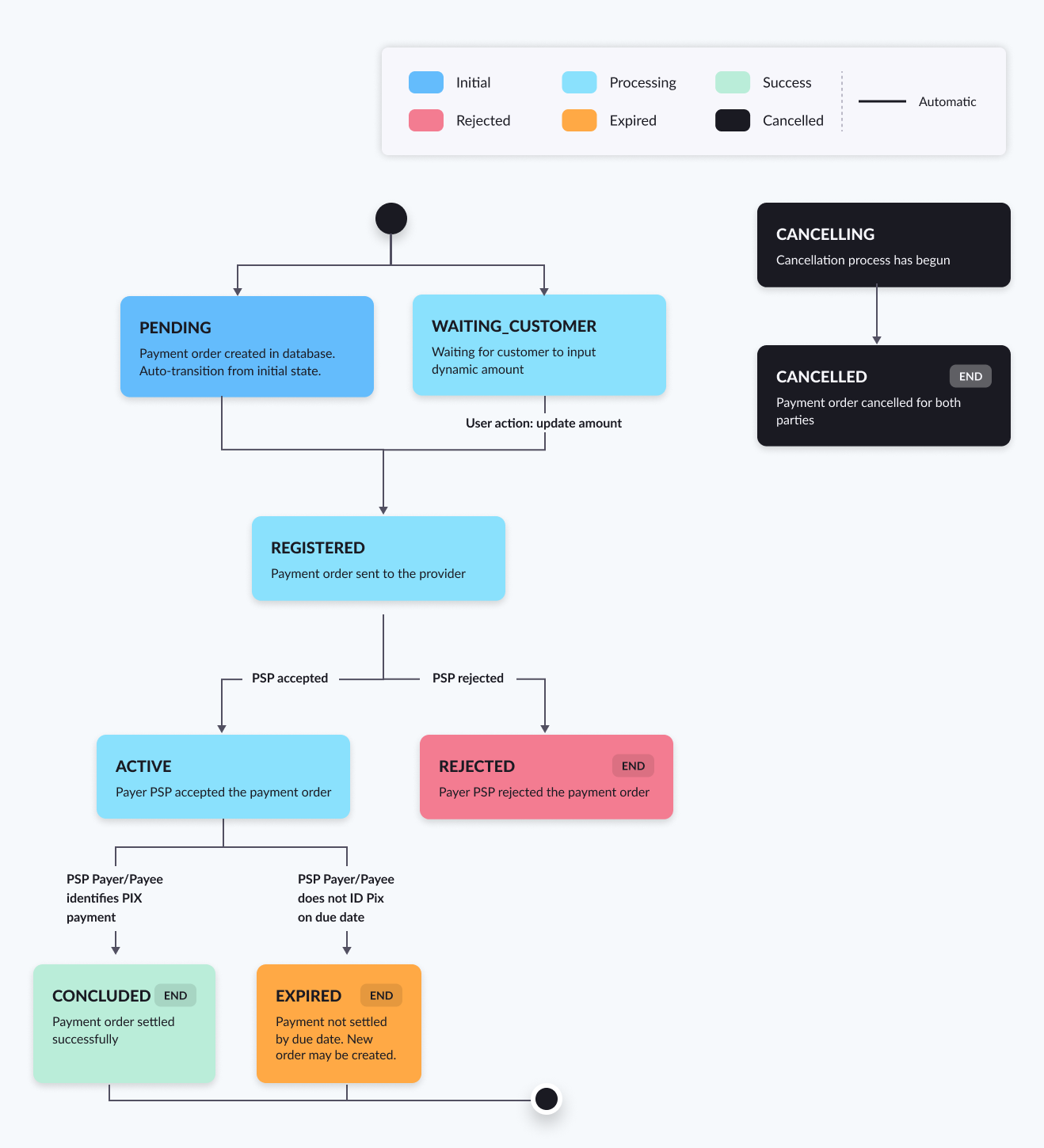 - Payer or Receiver manually cancels via the Cancel payment order (POST /v1/pix/automatic/payment/order/cancel) endpoint. This generates the Pix recurrence payment order status changed event with