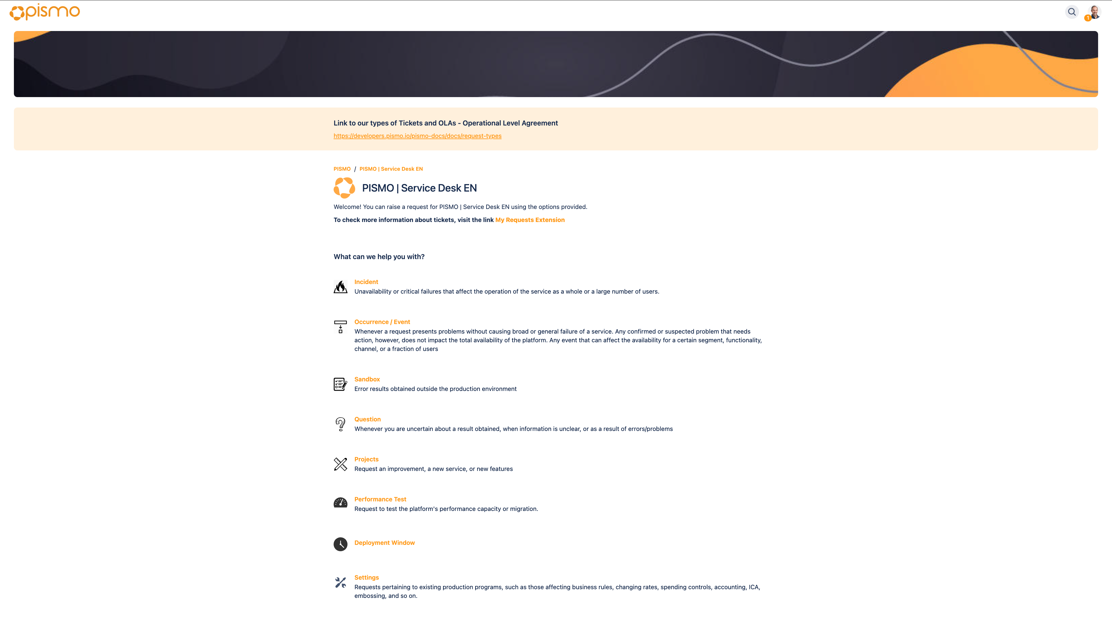 The Pismo Service Desk enables you to open and track service requests. For information about the types of requests you can submit, refer to Request types.